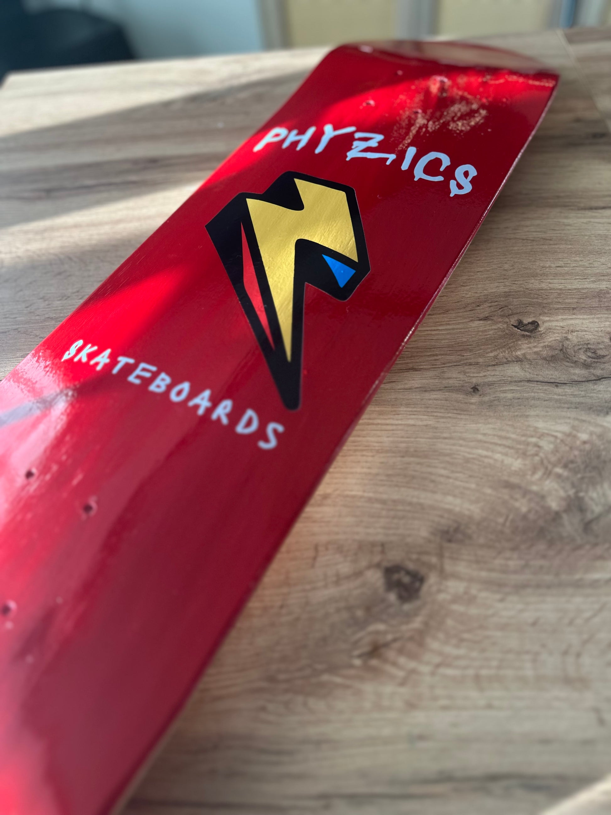 • Bold Design: Eye-catching red deck with a dynamic yellow and black lightning bolt graphic and drippy “Phyzics Skateboards” typography.